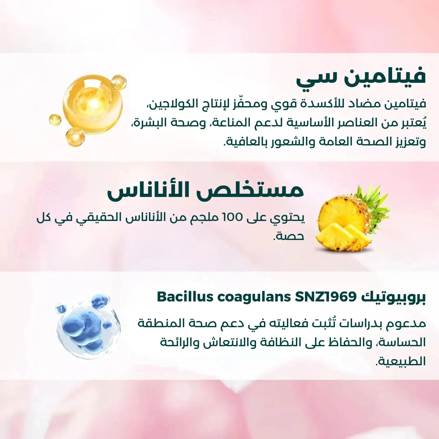 إييه، تحتوي على Bacillus coagulans SNZ1969، وهو بروبيوتيك مُثبت سريريًا يساعد في الحفاظ على انتعاش المنطقة الحساسة، تقليل الروائح، وتوازن الـpH.*